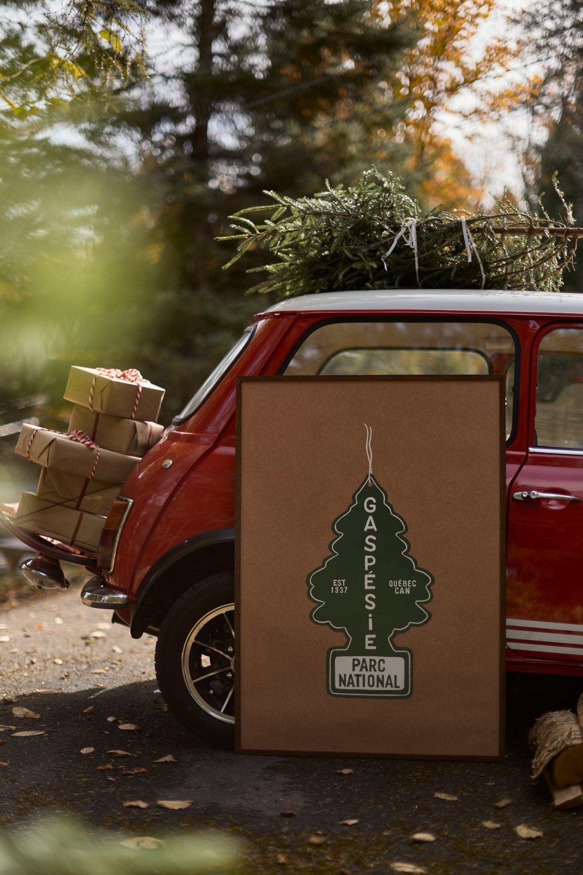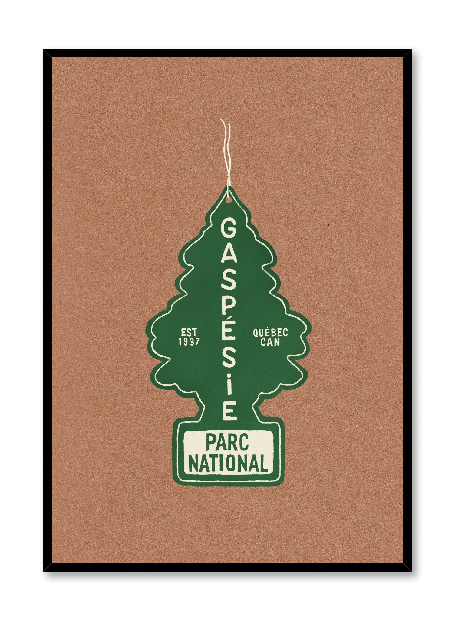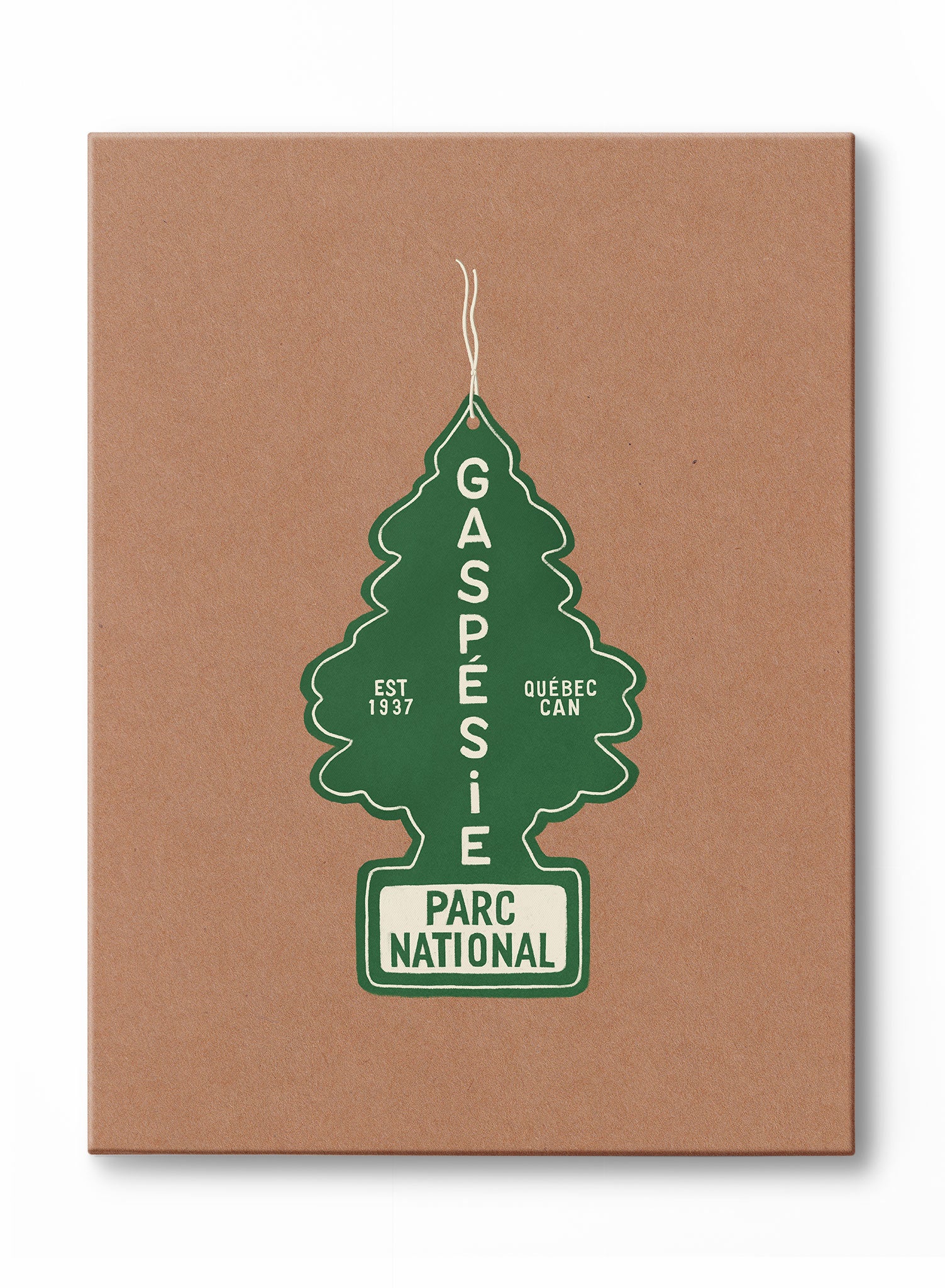 This artwork features a tree-shaped tag design that bears a resemblance to the well-known air fresheners often seen hanging in cars, giving it a familiar and playful appearance. The central image is a green pine tree silhouette with the words 'Gaspésie Parc National' prominently displayed in white text. The reference to Gaspésie, a national park located in Québec, Canada, adds a touch of nature and travel nostalgia, evoking memories of road trips and outdoor adventures.