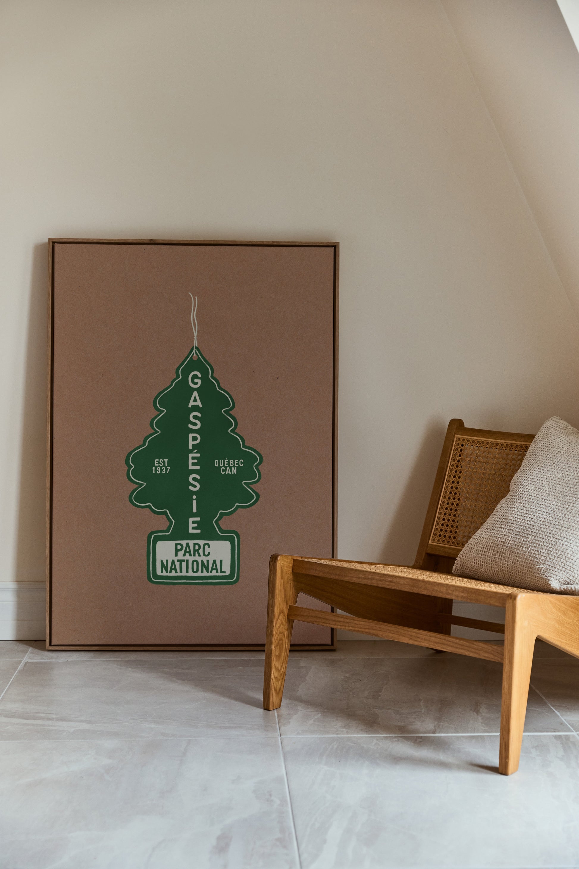 The background of the print is a muted brown, which allows the vibrant green of the tree and the clean white text to stand out. The overall simplicity of the design and the nostalgic association with the tree-shaped freshener brings a sense of fun to the artwork.