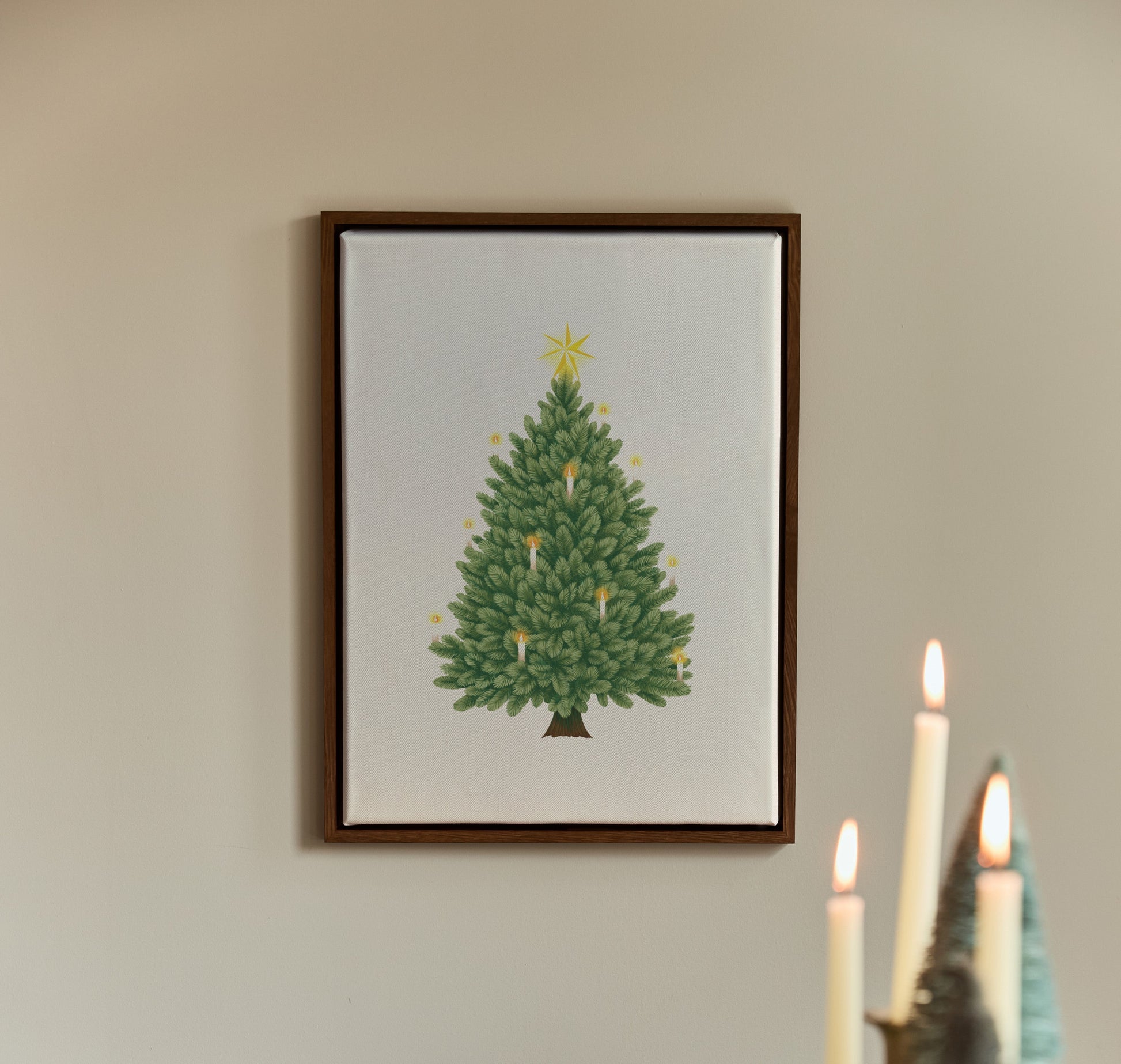 Celebrate the beauty of tradition with this classic holiday print, featuring an evergreen tree adorned with softly glowing candles and crowned with a golden star. The rich green branches contrast beautifully against the creamy backdrop, creating a scene that feels timeless and serene. The warm light from the candles casts a soft glow over the tree, evoking the cozy atmosphere of Christmases past.