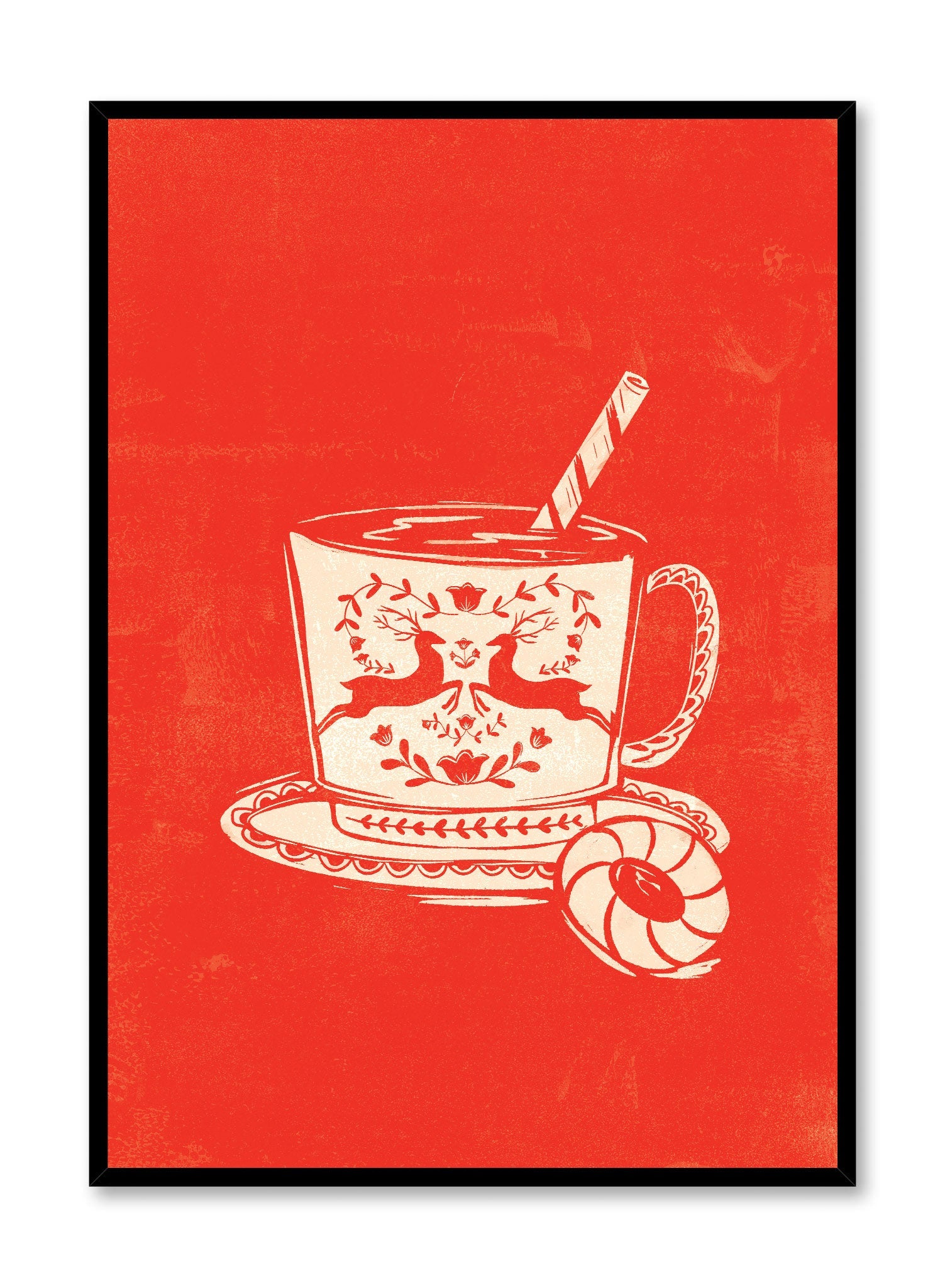 This delightful print captures the warmth and coziness of a steaming cup of hot chocolate, complete with a candy-striped straw and a delicate holiday-themed mug. The mug is adorned with charming reindeer and floral motifs, rendered in soft cream tones against a warm red background. A cookie rests on the saucer beside the mug, adding a touch of sweetness to the scene.