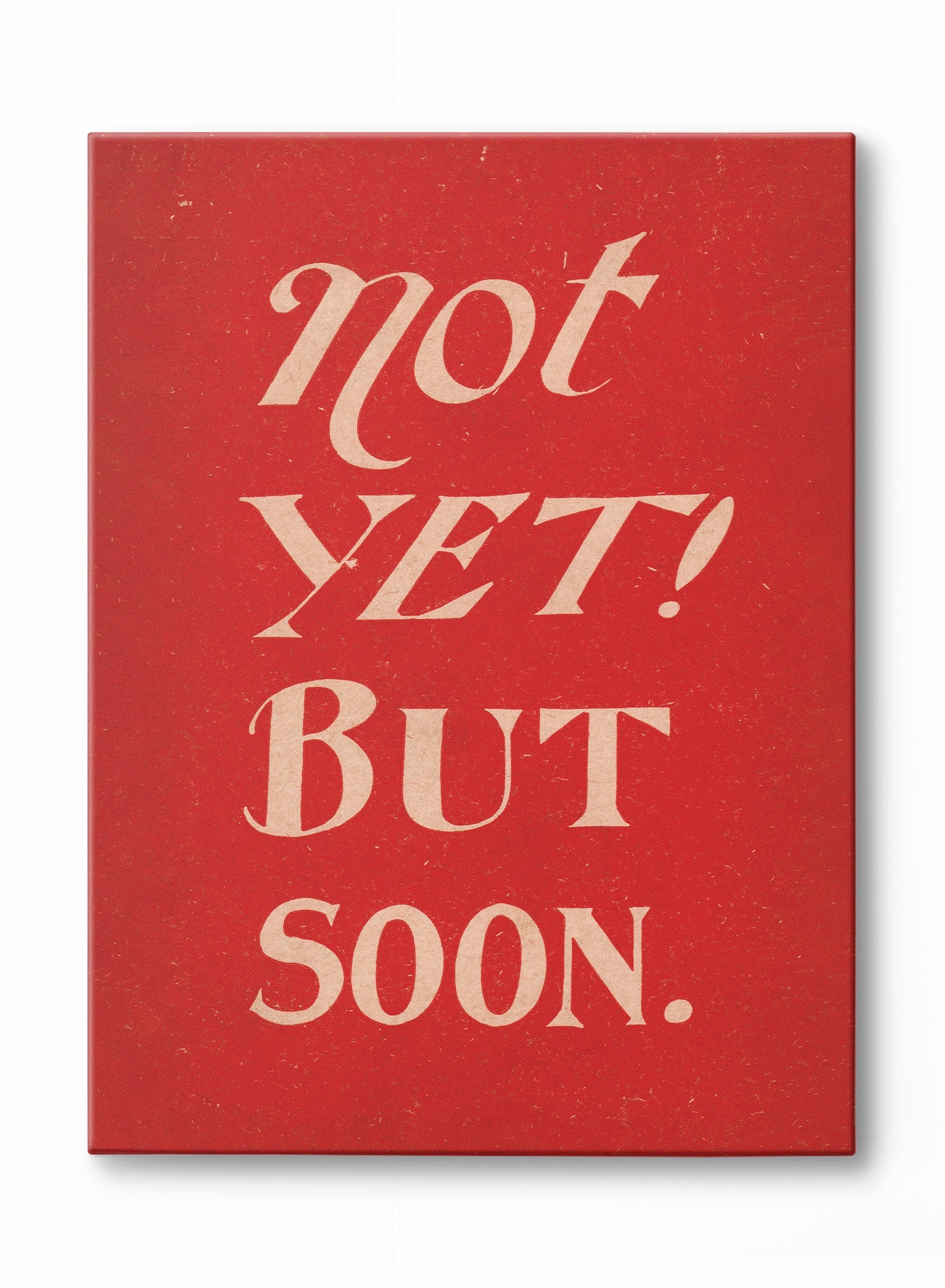 This typography artwork features the bold phrase 'Not Yet! But Soon.' in a vintage serif font, set against a textured red background.